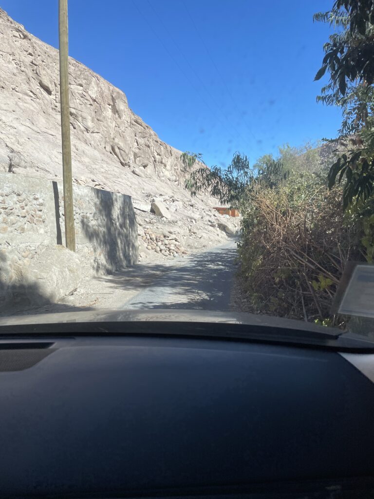 Van Codpa naar Putre was er een binnenweg maar die werd ons afgeraden. We zouden eerst weer van Codpa afdalen naar route 5. Dan richting Arica, tank volgooien ( in Putre zijn er geen benzinestations) en via een gestaag oplopende route 11 richting Putre. Putre ligt op 3500 meter hoogte. Op zo’n half uur voor Putre zijn ze bezig met wegwerkzaamheden. Wij waren daar ongeveer om half twee.