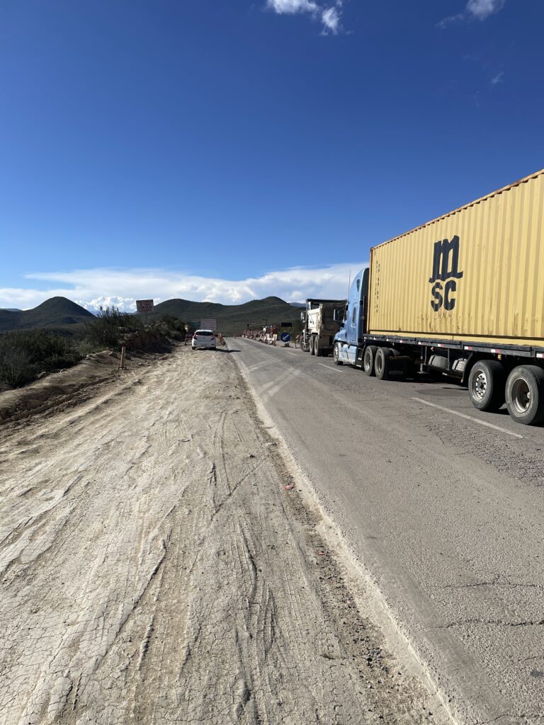 We sloten achter een vrachtwagen aan in de veronderstelling dat we niet al te lang hoefden te wachten. Niets was echter minder waar want op een bord stond dat de weg van 1 uur tot 5 uur was afgesloten. Nagevraagd, bleek dus ook dat we pas om 5 uur verder konden. Het werd uiteindelijk 6 uur voordat we verder konden. Twee kilometer verder hebben we nog keer een half uur moeten wachten. Het werd dus heel laat voordat we bij de lodge waren. Het was al donker. In Putre zijn we toen nog even wat gaan eten